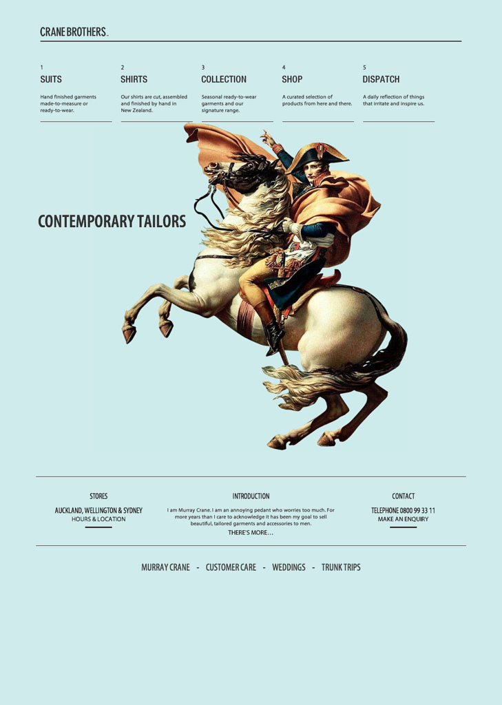 ニュージーランド発のメンズアパレル “Crane Brothers” のブランドサイト。ミニマルで丁寧なタイポグラフィー、クロップされた大きな写真の大胆な配置、絶妙な背景のカラースキームによって上品で洗練された印象づくりに成功している。pjaxのほか、現在多く目にすることとなった、スクロール追従するグローバルナビゲーションのフロート表示も早くに取り入れていた。